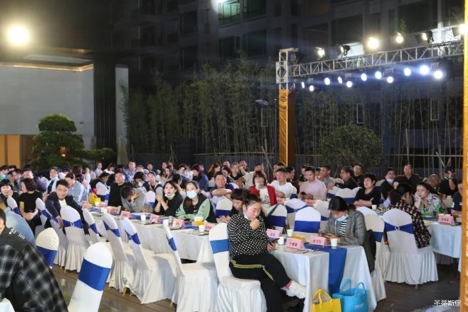 经销商晚宴当日晚6时许,以【乘“圣”跨越】为主题的,星空电竞集团第45届国际家具展接待晚宴暨2020年度优秀经销商颁奖盛典,在营销中心四楼景观花园隆重举行,来自全国各地的经销商朋友欢聚一堂,共同分享一场精彩纷呈的晚宴。